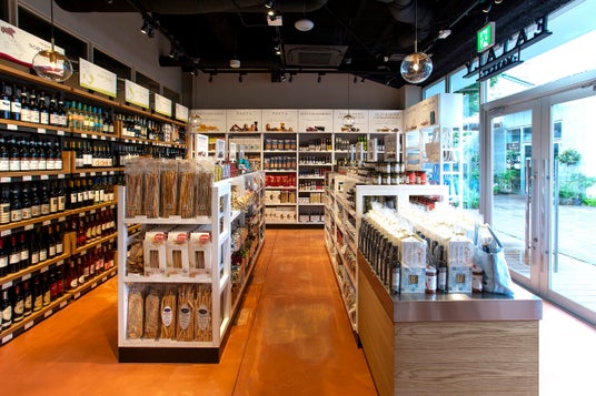 マーケットにはイタリア直輸入の食材やワインを豊富に揃えています。試食サービスも人気です。