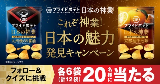 株式会社湖池屋(社長:佐藤章)は、世界から注目を集める“日本産食材の魅力”を支える匠の技と情熱の結晶である“日本の神業”を中核とした「湖池屋プライドポテト 日本の神業」シリーズより、「湖池屋プライドポテト 日本の神業 九州焼のり醤油」「湖池屋プライドポテト 日本の神業 京都柚子七味」を2024年6月24日(月)に発売します。さらに、宗像・京都の“日本の神業”をお伝えすることで、日本全国に元気をお届けしたいとの想いから、商品がセットで当たるキャンペーンを実施します。