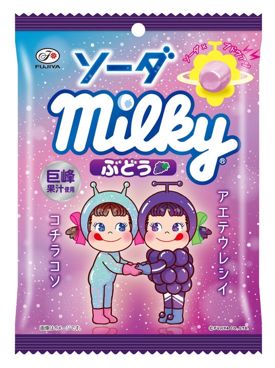 昨年発売し好評だった「ソーダミルキー袋」が、巨峰果汁を組み合わせることでさらに美味しく楽しくパワーアップして帰ってきました。ペコちゃんのようでペコちゃんじゃない!? 「ソーダ星人」と「ぶどう星人」が登場するパッケージにもご注目ください。