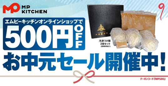 『つけ麺専門店 三田製麺所』『薄皮餃子専門 渋谷餃子』などを運営する株式会社エムピーキッチン(本社:東京都渋谷区、代表取締役:村上竹彦)の公式通販ショップ『エムピーキッチンオンラインショップ』にて、6月24日(月)から7月10日(水)までの期間中、『お中元セール』を開催いたします。期間中、3,000円以上ご購入の方限定で、入力コード【MP500】のご利用でお会計を500円引きさせて頂きます。
