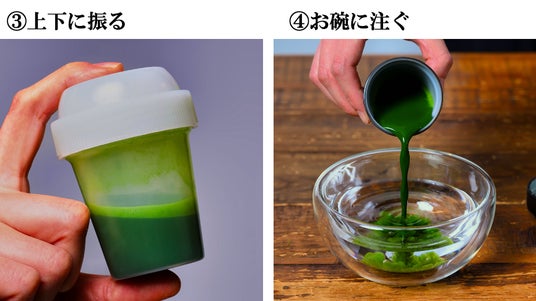 - 特徴1:水と抹茶を入れて振るだけで濃厚な抹茶原液に