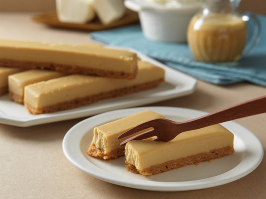 チーズ生地には、道産とオーストラリア産のクリームチーズ、イタリア産マスカルポーネを使用し、コクと乳味が感じられるレシピに仕上げました。ほんのりキャラメル風味を漂うベイクドチーズのスティックケーキは、ルタオプラス店の限定商品です。