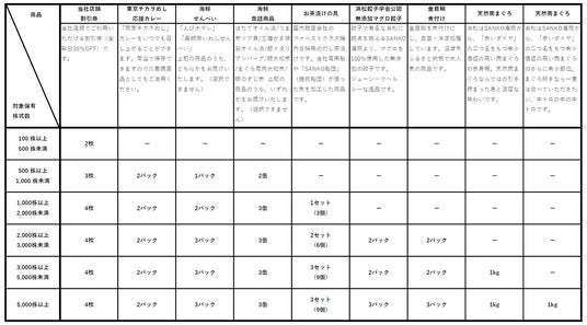 ※1 上記優待品につきましては、季節や漁獲の状況等により、将来に向かって変更される場合があります。予めご了承ください。 ※2 割引券のご利用方法及びご利用上の注意 ・他の割引券及び金券、インターネットクーポン等との併用はできませんのでご注意ください。 ・一部ご利用いただけない店舗がございます。ご利用前に当社HP内「株主優待制度」をご参照ください。(https://www.sankofoods.com/ir/stock/benefit/) ・盗難、紛失または滅失等の場合、再発行いたしません。 ・1会計につき1枚のご利用となり、割引上限は10,000円です。 ・値引き額は税込の会計金額から割引いたします。 ・割引券の有効期限は、6ヶ月間といたします。 ・他の優待商品との交換はできません。 ※3 常温品と冷蔵・冷凍品を分けて発送する場合、異なる時期に2回にわけて発送する場合がございます。