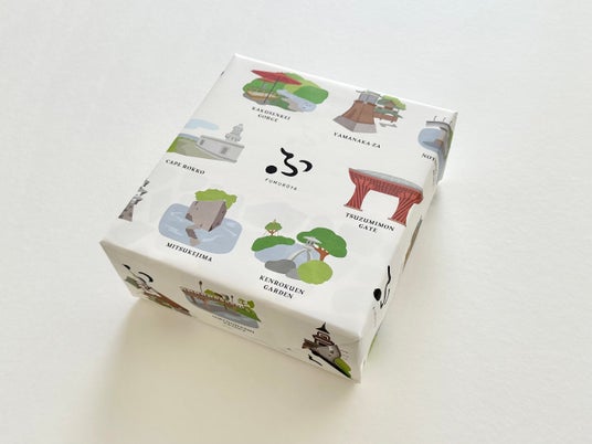 包装紙には能登・金沢・加賀の観光名所を配し、箱には石垣模様を施しています。いしかわの魅力をあらためて伝え、能登への想いを表現しました。昆布だしが上品に香るあっさりとした味わいのおすましに、能登の美しい花「のとキリシマツツジ※」を映した加賀麩が浮かびます。石川県の文化が育んだ加賀麩に、郷土への想いを込めたひと品となっています。