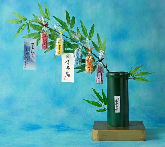 伝統の製法を守り続ける<緑寿庵清水>より。苺・檸檬・天然水サイダー・蜜柑・巨峰の金平糖を五色の短冊に見立てた、笹飾りとともに楽しめる七夕限定品です。