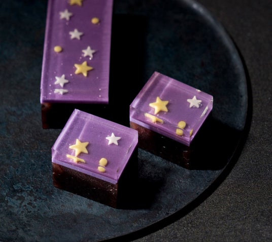 右:職人の伝統技術で季節の意匠を施した棹菓子。夏の夜に輝く星を透き通る琥珀羹にとじこめ、風味豊かな小倉羹と合わせました。