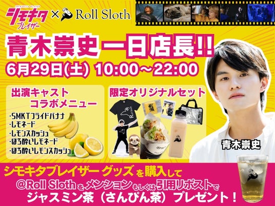 映画『シモキタブレイザー』には、芸能事務所なないろ(株式会社七色)から注目俳優である青木崇史が出演しています。6月29日(土)にはDVD発売を記念して、青木崇史がRoll Sloth? の一日店長に就任。チェキやアクリルスタンド、Roll Slothの人気グッズを「青木崇史オリジナルセット」として販売します。