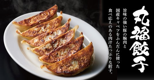「丸福餃子」税抜390円(税込429円)は、旨味の強い豚の腕肉と国産キャベツをふんだんに使用し、外はパリパリ、中は肉汁がたっぷりでジューシーな大ぶりで食べ応えのある餃子です。サイドメニューの「ヤキメシ卵黄のせ」税抜590円(税込649円)や白い衣が特徴の「唐揚げタレがけ」税抜430円(税込473円)、おもちゃ付のおこさまメニューなどの商品も充実。お持ち帰り餃子販売専用スペースで焼餃子、冷凍生餃子も販売しております。和の雰囲気を感じられる店内で、おひとりさまからご家族連れまで様々なお客様にご利用いただけます。