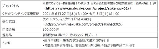 お酒好きの方からの熱狂的な支持を受け、昨年のクラウドファンディング合計調達額*日本一の3500万円を記録した酒ハックプロジェクト株式会社(本社:浜松市中央区、代表:種石健一)は、国内のウイスキー蒸留所で使用されていた古樽を活用したまったく新しい酒熟成キット「樽スティック・樽プレート」を開発。その応援購入をクラウドファンディングサイト「Makuake」にて募集を開始しました。募集期間は2024年6月27日(木)から。受付終了日は8月3日(土)まで。数量限定最大50%割引で販売しております。(*酒熟成キットとして 弊社調べ)