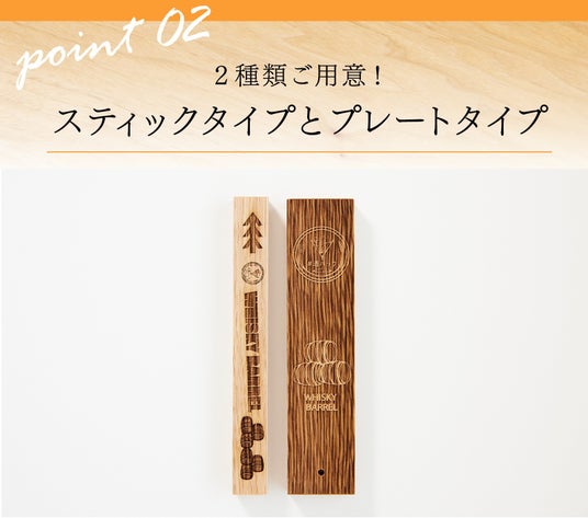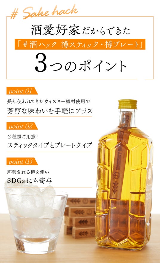 今回登場の「#酒ハック 樽スティック・樽プレート」は、そんなご意見も参考に、より手軽にいつものお酒をアップグレードできる、「本物の樽」を使った熟成キットです!