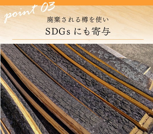 今回素材にしたのは、国内の著名蒸留所で人気ウイスキーの熟成に使用されていたウイスキー樽。何十年もお酒を貯蔵し、芳醇なお酒の成分が染みこんだ樽材です。