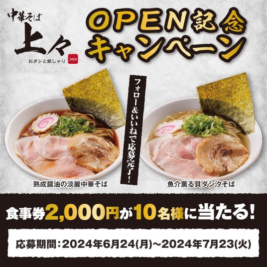 『おダシと銀しゃり 中華そば 上々-jojo-』(住所:大阪市東淀川区)を2024年7月3日(水)にオープン致します。