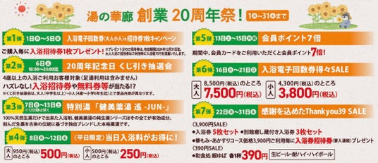 創業20周年を記念して、創業日である7/6には、くじ引き抽選会を開催。7/8-12は大人入浴料ワンコイン500円、小人250円の特別価格でご入浴いただける等、お得なイベントが満載です。この機会に「湯の華廊」で、大阪層群地下1,001mから湧き出る源泉かけ流しの天然温泉をご堪能ください。