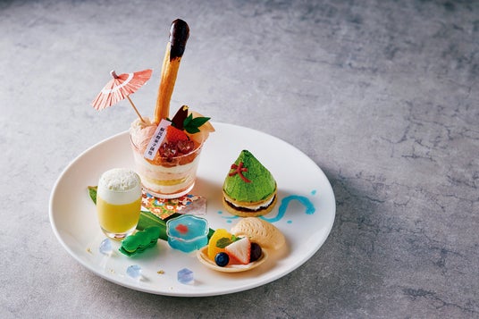 2021年より形を変えながら続く人気シリーズ『京の夏祭りプレート』を今年もご用意いたしました。鉾に見立てた、細長いエクレアを桃のパフェに添えて「祇園祭」の山鉾を、抹茶のモンブランで「大文字送り火」を表現しています。この他、生ビールと枝豆をイメージしたマンゴープリンとマカロンや、金魚鉢の寒天、貝殻型フルーツもなかなど、暑さをしのぐスイーツタイムに遊び心あふれるワンプレートをセットドリンクとともにお愉しみいただきたいと考えております。