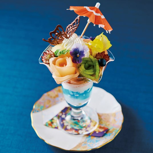2024年注目の「紫式部」をテーマにしたフルーツパフェ。桃やキウイ、ぶどうを花型にアレンジし、花束に見立てたフルーツパフェ。レモンのジュレやヨーグルトムース、桃のコンポートにバニラアイスなど程よい甘さと爽やかな味わいをお愉しみください。エディブルフラワー、蝶々型のチョコレートが愛らしい一品。