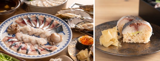 コースのメインは、島根県出雲の郷土料理「鯖しゃぶ」を江戸前風にアレンジした「真鯖生姜しゃぶ」。鯖の柔らか食感と美味しさを堪能いただけます。〆のお食事には、赤酢のシャリに金華鯖の干物を混ぜ込み、〆鯖で巻いた手ごね寿司をご用意。鯖の魅力を余すことなく味わっていただけます。