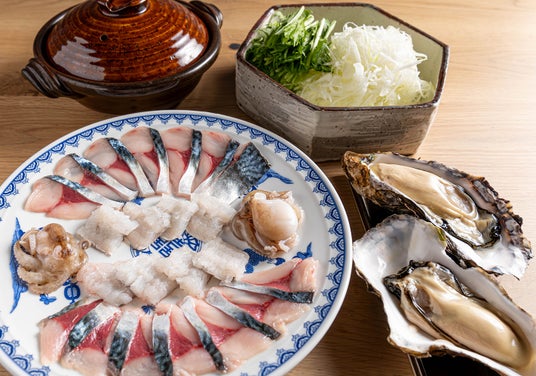 ストレスがない状態で活〆された鯖は、臭みがなく、出汁を通してもとても柔らかい食感が特長です。梅雨明けに旬本番となる活〆鱧や、大ぶりの生牡蠣と一緒にお楽しみいただける贅沢な海鮮しゃぶです。