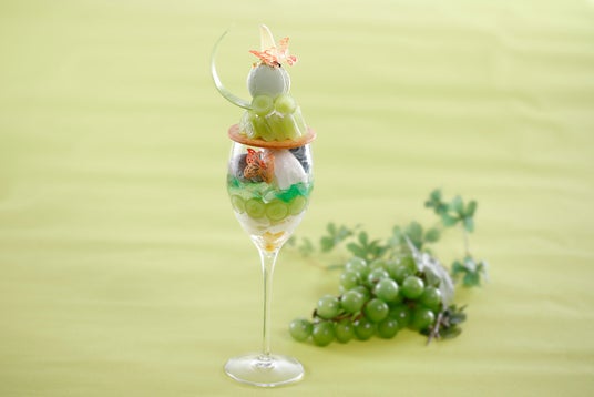 8月のテーマは『マスカット』。トップにはジューシーなシャインマスカットの果肉にマカロンを重ね、蝶のチュイルで華やかさを演出しました。ライムとマスカットのフレッシュなゼリー、さっぱりとした口溶けのミルクジェラートがシャインマスカットを一層引き立てます。見た目も優美で爽やかな夏を感じる季節のパフェをご堪能ください。