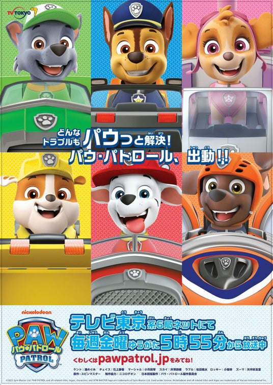 パウ・パトロールは、テレビ東京系列(6局ネット)にて毎週金曜日ゆうがた5時55分から放送中。また、Prime VideoのニコロデオンチャンネルやParamount+など、各種配信サービスでもご覧いただけます。