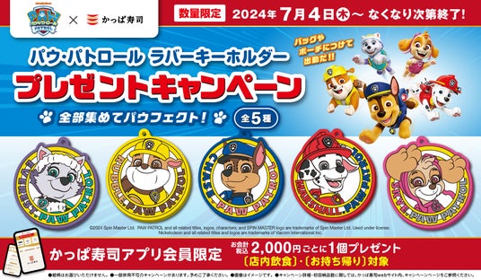 コロワイドグループのかっぱ寿司(カッパ・クリエイト(株) 本社:神奈川県横浜市、代表取締役社長:山角豪)は、テレビ東京系にて放送中の大人気プリスクール向けアニメ『パウ・パトロールTM』とコラボレーションし、2024年7月4日(木)より、かっぱ寿司全店にて公式アプリ会員限定のプレゼントキャンペーンを開催いたします。