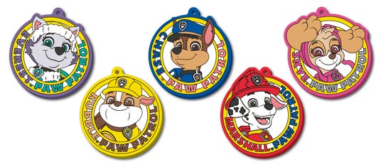 「ラバーキーホルダー」は「チェイス」「マーシャル」「ラブル」「スカイ」「エベレスト」の全5種です。お会計2,000 円(税込)ごとに、「ラバーキーホルダー」を1個プレゼントいたします。(絵柄はお選びいただけません。)通園・通学バッグやポーチなどにつけて『パウ・パトロール』キャラクターとの日常をお楽しみください。
