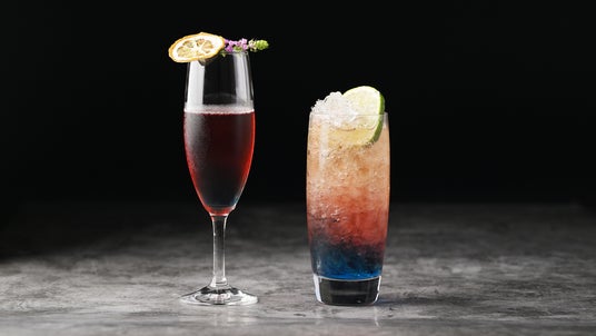 アルコールカクテル(写真左)は梅酒や紫蘇のリキュール、飾りには穂紫蘇を使用して和のテイストに。ノンアルコールカクテル(写真右)は、梅シロップにジンジャーエールを合わせて爽やかな味わいをお楽しみいただけます。
