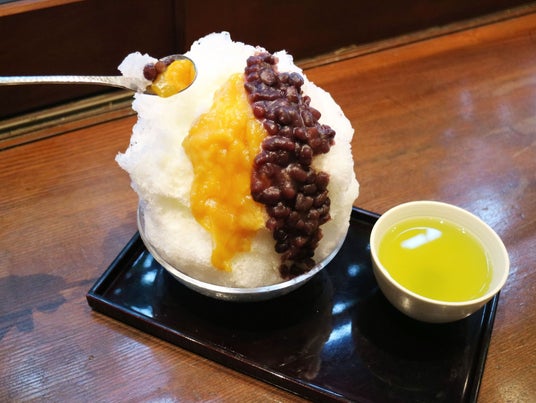 かき氷1杯に、くず餅の発酵過程で発見された「くず餅乳酸菌」が10億個も入っているので、ひんやり冷たいけどお腹にやさしいかき氷となっております。