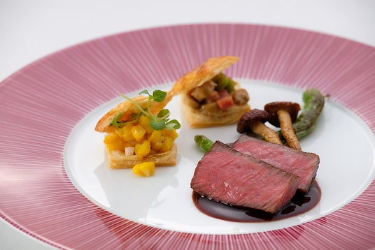 フランス料理の王道スタイルを表現したメインディッシュの一皿。赤ワインをじっくり煮込んで作りあげたソースと、肉汁溢れる黒毛和牛の旨味とのマリアージュで幸福感に包まれる一皿です。付け合わせには、旬野菜とトウモロコシ、キノコと枝豆の2種タルトレットを添えています。
