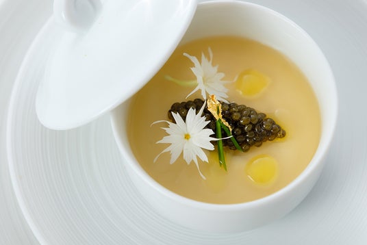 カリフラワーの滑らかなクリームに、キャビアの塩気が絶妙なアクセントを添える一品。ベルサイユ宮殿内でも指折りの食通だったとされる国王ルイ15世の公妾デュ・バリー夫人が、カリフラワーが大好物だったという逸話からアイデアを得た、クラシックなムース料理です。