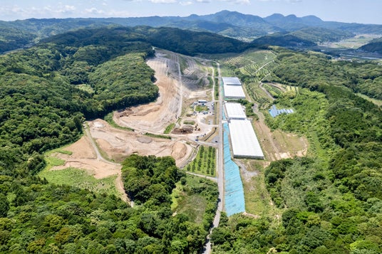 国東半島の山あいに広がる国東QLiVE GARDEN。南側(左)に造成中の畑、北側(右)に現在栽培中のオリーブ畑が広がる。