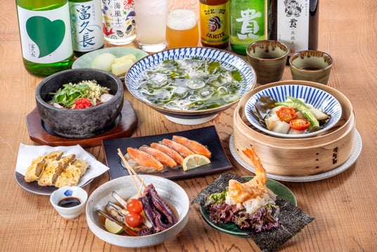 2人の実力派杜氏が四十八漁場のために醸すオリジナル日本酒「富久長 美穂のお気に入り/広島(一杯680円~)」と「貴 魚誂え/山口(一杯680円~)」」をはじめ、それぞれの蔵元からとどく夏限定の日本酒や、徳島産のすだち果汁を使った爽やかな「生絞りすだちサワー(550円)」など、すっきりとした味わいの夏酒やのど越しのよい日本酒ハイボールなど、料理の旨みを引き立たせるお酒をご用意しました。