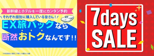 株式会社ジェイアール東海ツアーズ(本社:東京都中央区、以下JR東海ツアーズ)では、2024年7月2日(火)から、「EX旅パックなら、断然おトク」キャンペーンを開催します。往復新幹線+宿泊のパッケージ商品がプライスダウン、加えて9月以降の旅行に利用できる割引クーポンを、枚数制限なしで配布します。さらに大人気SALE企画『7days SALE』を同時開催します。7日間限定の衝撃プライスで、もっとおトクな旅行予約チャンスをお見逃しなく。