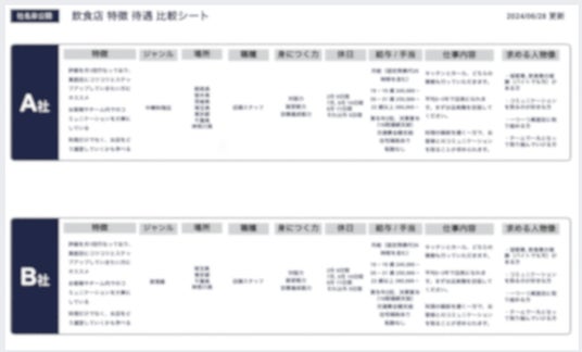 金融業界で好評だった「特徴・待遇一覧比較シート」を今回は、飲食業会でも作成いたしました!