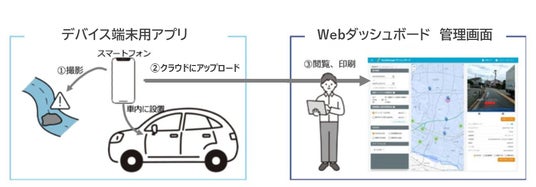 この技術を基に、株式会社アーバンエックステクノロジーズは、検出アプリを起動したスマートフォンを自動車内ダッシュボードに設置し道路走行するだけで、走行中に得られた画像から路面異常を自動検出し、Web上で一元管理可能なサービスを開発し、既に複数の地方自治体への導入実績があります。