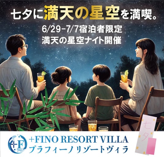 テンフィールズファクトリー株式会社(本社:京都府相楽郡精華町光台1-7 けいはんなプラザ9F、CEO:市川 裕)は、「+FINO RESORT VILLA」(プラフィーノリゾートヴィラ:三重県伊勢市二見町西1994-3)にて、「七夕フェア」を開催いたします。このイベントは、現地スタッフのおすすめスポットの満点の星空もと、地元ならではの軽食とドリンクを無料で提供いたします。さらに、チェアやレジャーシートも無料でレンタルいただけます。