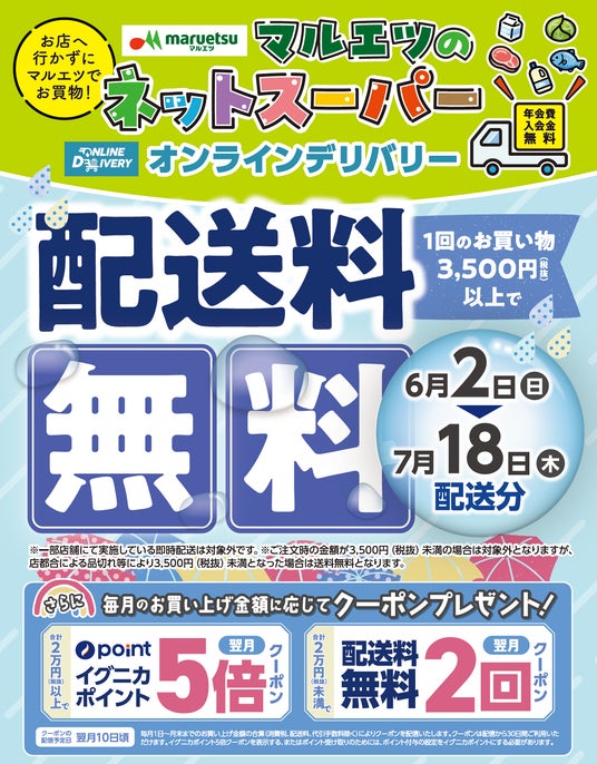 現在、「オンラインデリバリー」では、7月18日(木)までの配送について、3,500円(税抜)以上ご購入いただくと、配送料が無料になるキャンペーンを実施しております。