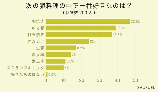 候補の卵料理の中から一番好きなのは?の問いに対して最も多かったのが「卵焼き(23.5%)」でした。 次いで「ゆで卵(19.5%)」「目玉焼き(18.5%)」という結果でした。「卵焼き」はお弁当のおかずとしても重宝しますよね。また茹でるだけでいい「ゆで卵」、焼くだけで作れる「目玉焼き」は調理が簡単でいいですね。
