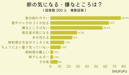 卵の気になる・嫌なところを尋ねたところ、1位は「殻が割れやすい(38.5%)」、2位「殻やパックのゴミが出る(32%)」となりました。スーパーで購入してから家に持って帰る時に割れないように運ぶのに気を遣いますよね。また、食べ終わったあとのパックゴミや調理の際に出る卵の殻は嵩張るので処分するのが面倒です。