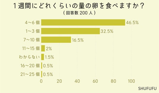 1週間に食べる卵の量に関しては1位「4~6個(46.5%)」、2位「1~3個(32.5%)」でした。日数で換算すると、1週間の半分以上1日1個は卵を食べるという方が多いようです。