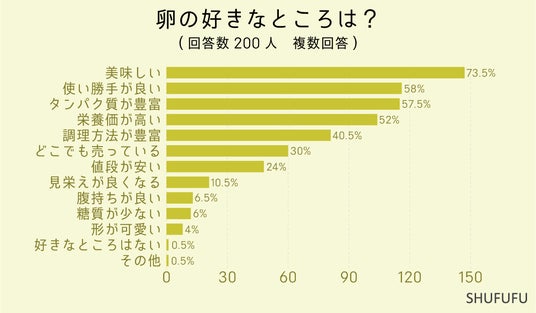 卵の好きなところを尋ねたところ、1位は「美味しい(73.5%)」、2位「使い勝手が良い(58.%)」となりました。栄養素や価格などのメリットもある卵ですが、多くの人がシンプルに卵の味が好きだという方が多いようです。