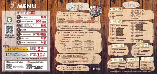 シーシャはスイーツ系、ミント系、フルーツ系、フラワー系、など常時30種類以上のフレーバーを提供しています。