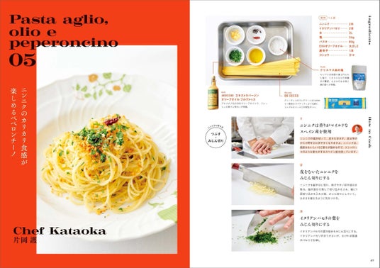 掲載されている日高良実シェフのオイルサーディーンのペペロンチーノ。まずはこれからやってみたいです!