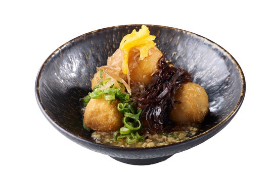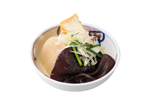 (金のおにぎりと天白のかつお出汁 かつおとぼんた、190円)※掲載の写真は盛り合わせ かつおとぼんた自慢のカツオベースの出汁で、福島県産黒きくらげをおでんにアレンジしています。出汁をよく吸った、シャキシャキの黒きくらげを召し上がって、体の芯まで温まってください。