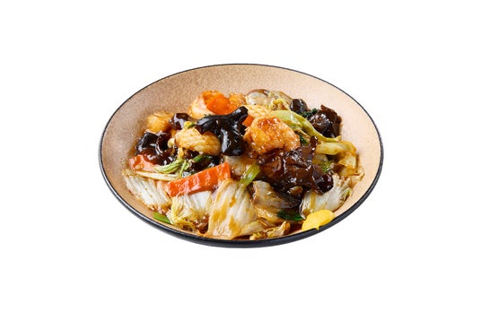 (大連餃子基地 DALIAN、1,350円) エビやイカ、野菜といった具材をふんだんに使用した、ほんのりと甘じょっぱい海鮮五目餡で仕上げた固焼きそばです。定番の中華料理で、黒きくらげのプリプリとした歯ごたえをお楽しみください。