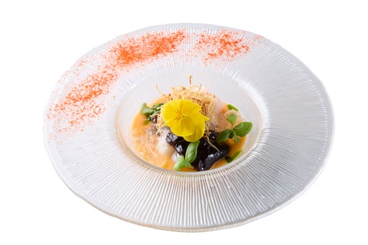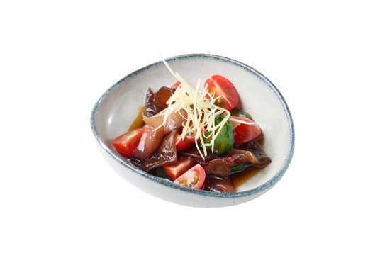 ・生きくらげと海老のマリネ 桃のスープ仕立て