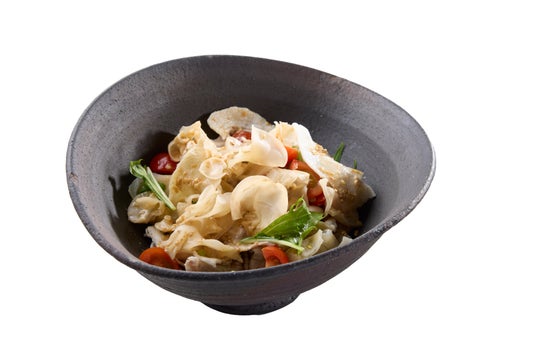 (TEPPAN KITCHEN、1,080円) 甘くてジューシーな国産和もち豚と、ぷるぷる食感に仕上がった白きくらげをごまダレポン酢で和えた、サラダ仕立ての前菜です。食欲が落ちがちな季節でも、罪悪感なくさっぱりと召し上がっていただけます。