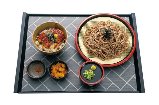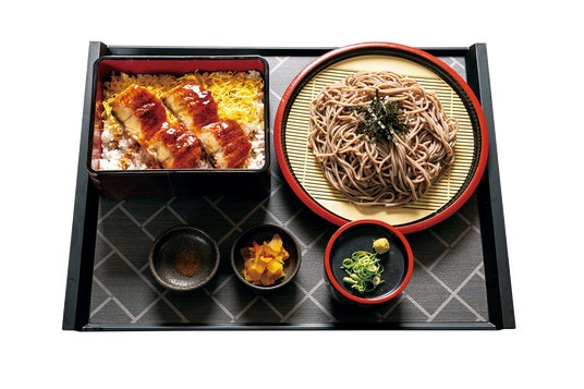 脂の乗った肉厚なうなぎをふっくらと香ばしく焼き上げ、わさびと海苔を添えてひつまぶし風に仕上げたうなぎご飯に、ざるそばをセットにしたお値打ちメニューです。