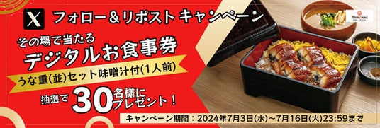 あわせて2024年7月3日(水)~2024年7月16日(火)の期間に「宮本むなし公式Xフォロー&リポストキャンペーン」を実施いたします。宮本むなしの公式Xアカウントをフォローし、キャンペーン投稿をリポストすることで応募でき、その場での抽選で30名様に、定食屋宮本むなし店内で「うな重(並)(1,090円税込み)」1人前をお召し上がりいただけるデジタルお食事券が当たるキャンペーンです。ぜひこの機会に宮本むなし公式Xのフォロー&リポストでのご参加をお待ちしております。