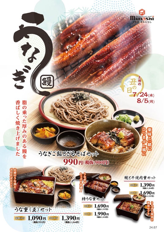 M&Sフードサービス株式会社(本社:大阪府大阪市、代表取締役社長:夏井 克典)が運営する定食チェーン「定食屋 宮本むなし」では、夏の風物詩「うなぎフェア」を2024年7月3日(水)より開催します。「うなぎフェア」では、「うなぎご飯とざるそばセット」、「うな重」「特うな重」「鰻(うなぎ)と牛焼肉重」の単品とざるそばのセットを期間限定で販売開始します。
