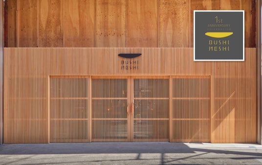 「BUSHI MESHI」外観と1周年記念ロゴ